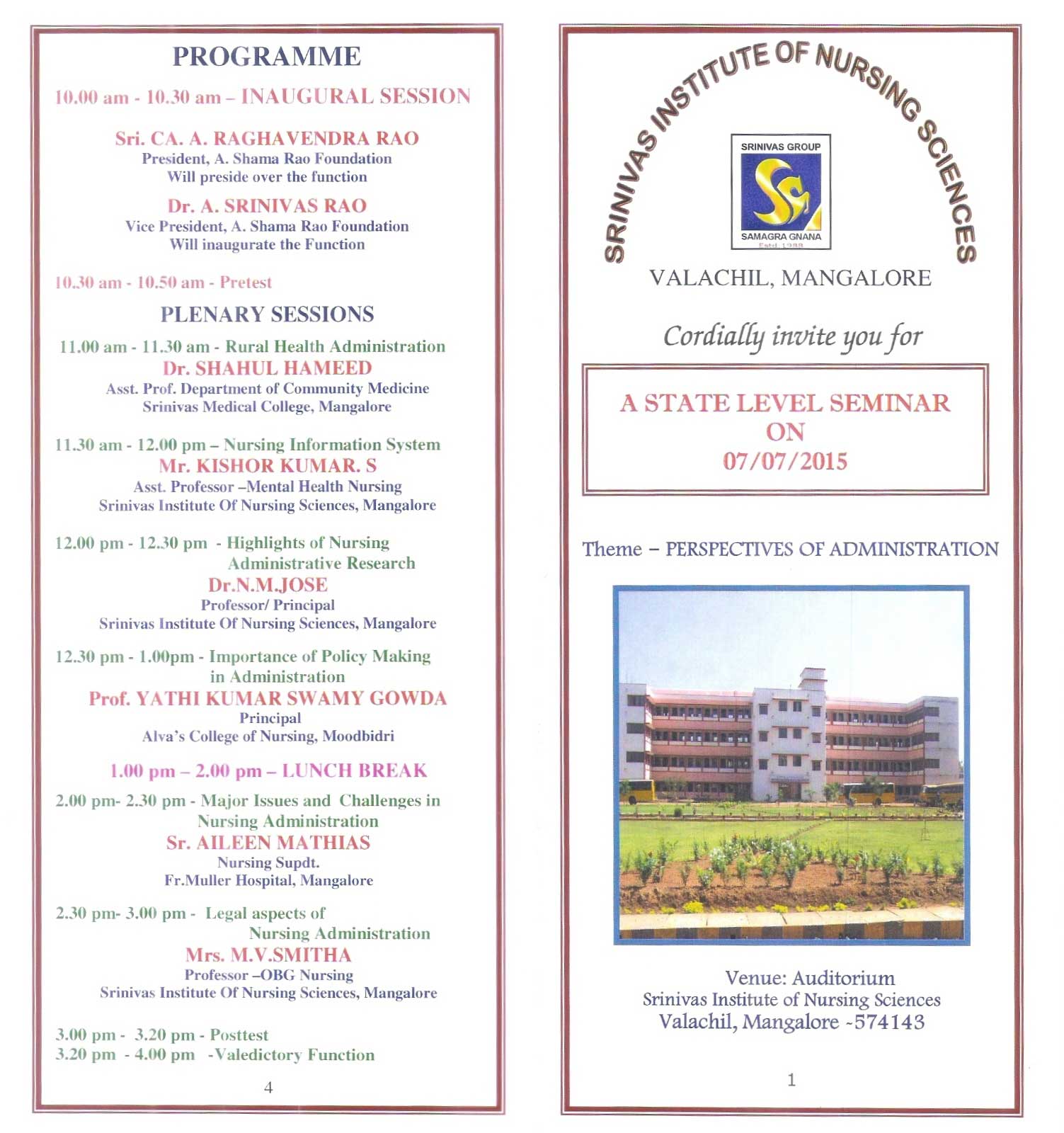 Srinivas Institute of Nursing Sciences, Mangalore will be conducting a State level Seminar on 07/07/2015.