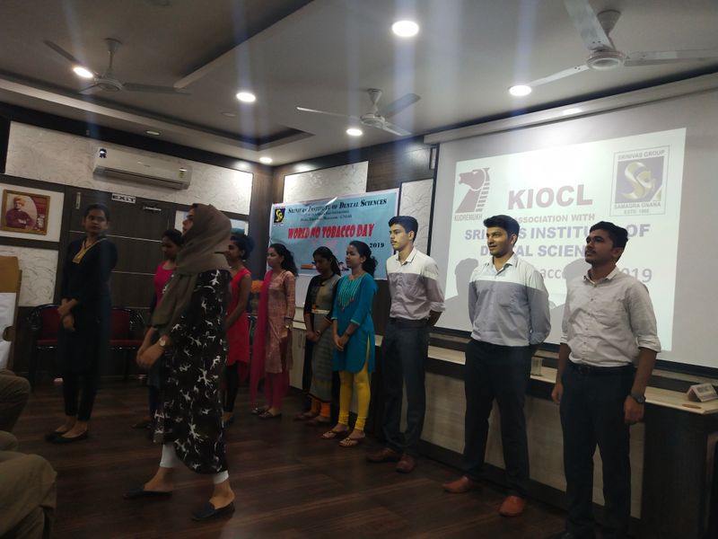A program was organised at KIOCL for their employees. The program included health talks (lectures) by Dr. Sreevidya and Dr. Kelvin. An introductory talk emphasising the importance of World No tobacco day was given by Dr. Kripal, Dr. Sangeetha presented Vote of Thanks. Interns of Srinivas Institute of Dental Sciences enacted street plays and skits in Kannada and Hindi focussing on the causes and consequences of tobacco use, followed by modalitites to quit the habit. Many anti-tobacco placards and posters were displayed. Thousands of anti-tobacco pamphlets were distributed to people of in and around Mukka and Surathkal through newspapers and personally.