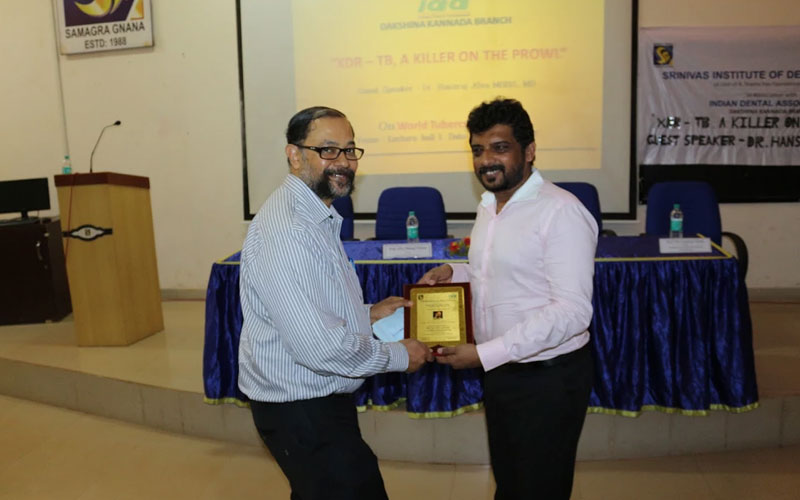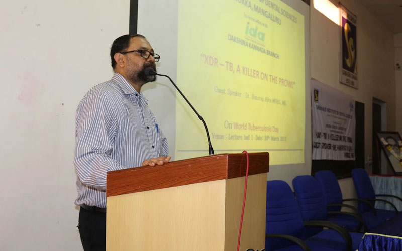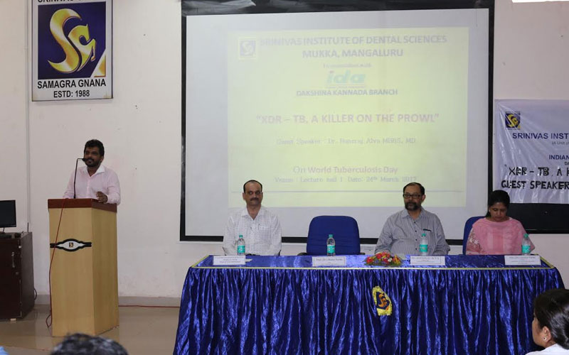 Srinivas Institute of Dental Sciences, Mukka, in association with Indian Dental Association, DK branch organized a guest lecture by Dr Hansraj Alva, Consultant Physician at Vinaya Hospital & Research Centre, on the occasion of World Tuberculosis Day, 24th March 2017 at their Mukka campus. Dr Hansraj Alva spoke about Tuberculosis, its spread, prevention & treatment with a special emphasis on Extensively Drug Resistant Tuberculosis (XDR-TB). The event was presided by Prof Dr Manoj Varma, Dean, Srinivas Institute of Dental Sciences & President, IDA, DK branch. Prof Dr Lavanya Varma, Associate Dean & HOD of Conservative & Endodontics welcomed the guest. Prof Dr Shailesh Kudva, HOD of Oral Pathology & Microbiology gave the vote of thanks. Dr Nishith. M.S and Dr Stuti Goyal from the Department of Oral Medicine & Radiology, convened the programme. The students of IIIrd year BDS performed a street play on TB awareness aimed at stopping people from discriminating and causing social stigma to those afflicted with TB and urging people to follow proper nutrition. This street play will be performed at various rural centres in the upcoming week.