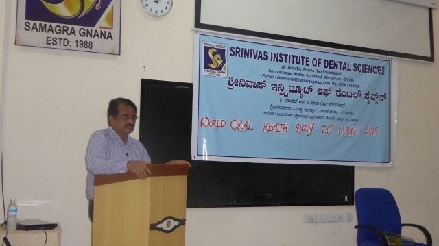 Srinivas Institute of Dental Sciences, a Unit of A. Shama Rao Foundation, conducted a successful Oral Health Week from 15th March to 20th March, 2015. This endeavor was well supported by Sri. CA. A Raghavendra Rao, President and Dr. A. Srinivas Rao, Vice President of Srinivas Group. The week began with a Free Dental Screening and Treatment Camp at Belman, in association with Rotary Club, Belman. About 50 patients received free treatment for various oral ailments. On 16th, a skit competition on Oral Health Awareness was organised for the students of SIDS, the winners performed the skit at an Oral Health Educational Programme on 18th for about 100 students of Srinivas Institute of Social Work. A spot drawing competition on "Healthy Teeth for Healthy Life" was also organised and three winners were given prizes on this occasion. This was followed screening Camp. About 65 students were screened for various Oral diseases and referral cards were distributed to avail free treatment for the same at urban dental health center, at pandeshwar. A Free Dental Treatment and Denture Camp was organised for inmates of "Chiranthana", Old age home at Surathkal on 19th march. About 30 inmates were benefited by the treatment. The week concluded on 20th March with celebration of Oral Health Day by a guest lecturer by Dr. K. Mukund, Senior Cardiologist, Head of Omega Hospital on "Systemic Implications of Oral Infections" to students and staff of SIDS.