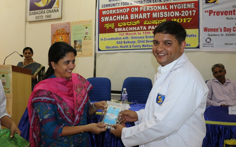 The department of food and nutrition, Government of India, in association with Srinivas Institute of Dental Sciences, Ayurveda Clinic Balkunje and the Indian Dental Association Dakshina Kannada branch organised a workshop and a continuing dental education program on 8 March 2017 at Srinivas Institute of Dental Sciences, Mukka. As part of the program, Dr. Sharath Karanth (H.O.D. Periodontics, Srinivas Institute of Dental Sciences) spoke on infection control and maintenance of cleanliness in clinics and hospitals. Mr. Jayaram Poojary (District Health Office, Mangaluru) spoke on the intake of nutritious food, environmental and personal hygiene. Dr. Shobharani (Medical Officer, Ayurveda clinic, Balkunje) talked about Ayurveda and Women health. Chief guest Dr. Lavanya Varma (Vice Dean, Srinivas Institute of Dental Sciences), Dr. Sreevidya Bhat (In-charge head, Public Health Dentistry department), Dr. Reshma Pai (H.O.D., Pedodontics), and Mr. Shivdarsan Tripathi (Demonstration Officer, Department of Food and Nutrition, Government of India) were present on the occasion. Painting competition and quiz programs were held as part of the International Women's Day celebration. Prizes were distributed to the winners. Teaching and non-teaching staffs, interns and students of Srinivas Institute of Dental Sciences participated in all the events.